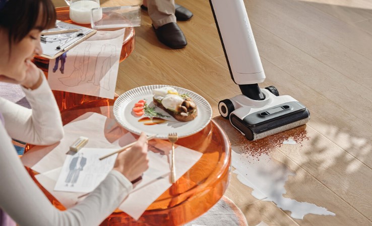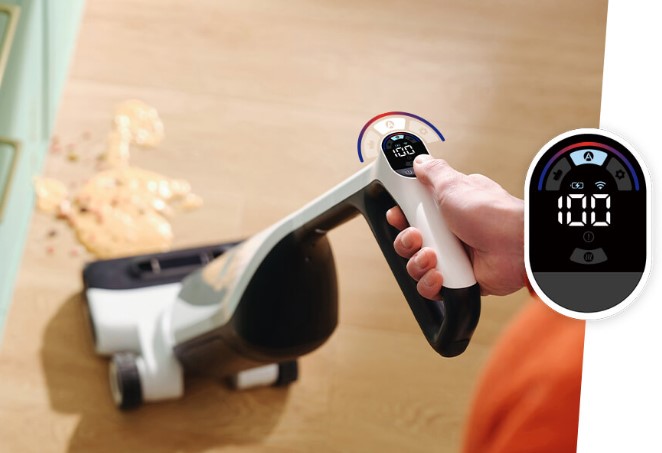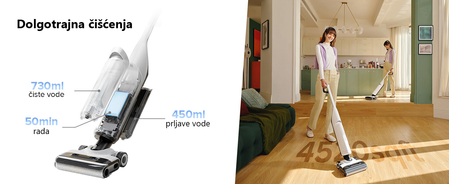 • Dugotrajno čišćenje:Bez potrebe za čestim punjenjem, Flexi Pro osigurava 50 minuta čišćenja s potpuno napunjenom baterijom, što omogućuje da bez prekida očistite veće površine. Osim toga, s posudom za čistu vodu od 730 ml i posudom za prljavu vodu od 450 ml, lako se možete posvetiti čišćenju prostora do 420 četvornih metara bez potrebe za ponovnim punjenjem.