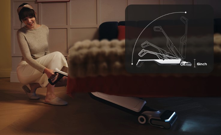 Roborock Flexi Pro opremljen je tehnologijom FlatReach, koja omogućuje temeljito čišćenje ispod niskog namještaja. Zahvaljujući snažnom reflektoru, svaki kutak će biti osvijetljen, osiguravajući besprijekorno čišćenje bez skrivenih nečistoća.